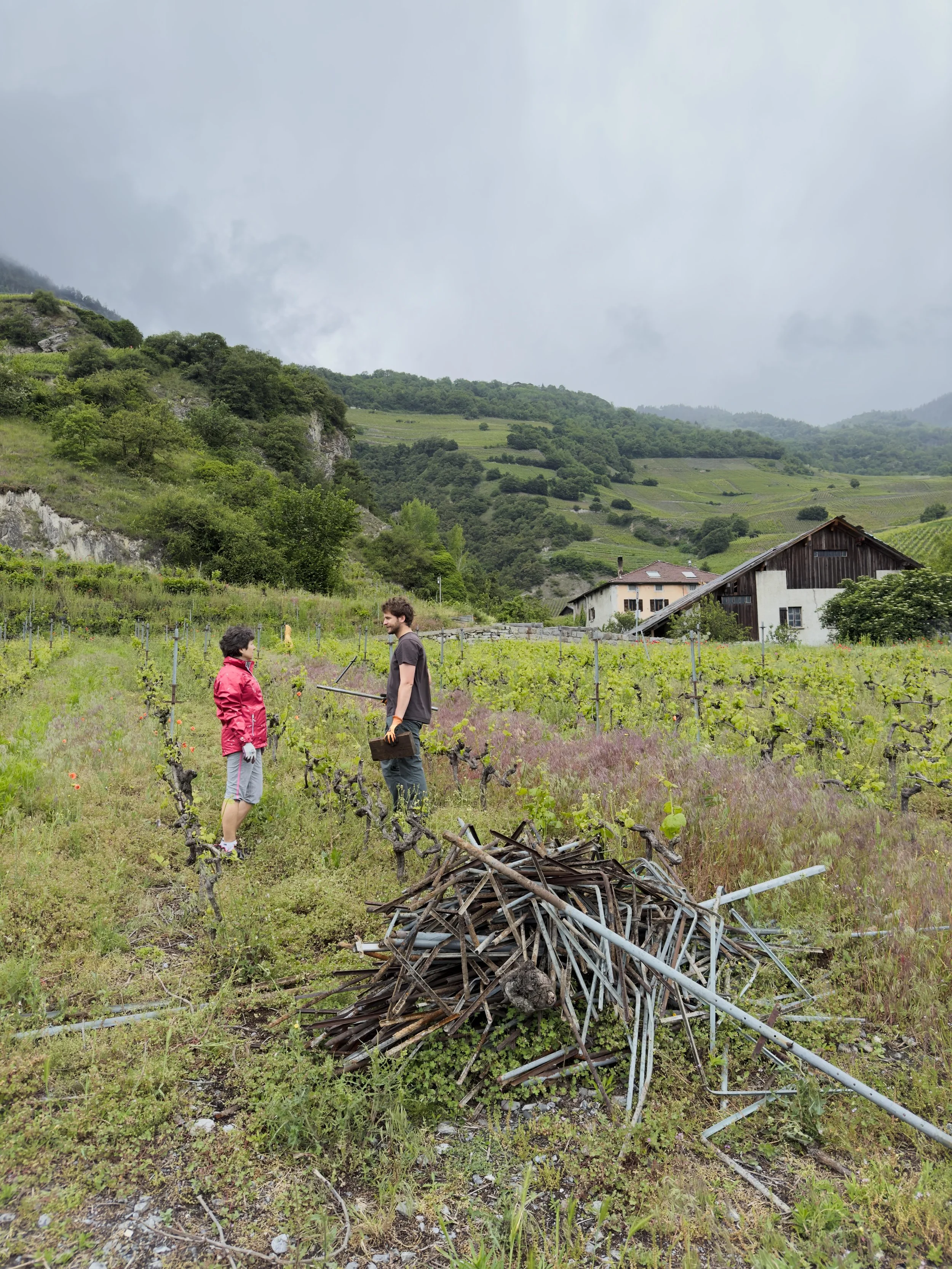 L’arrachage des piquets de vigne et autres ferrailles est un travail fastidieux lorsque fait à la main comme dans notre cas. Ce fut néanmoins un procédé important pour fortifier l’esprit de groupe et prendre nos marques sur le terrain. Ce travail, avec la coupe des ceps de vigne, aura duré environ 8 journées avec une participation active variable.