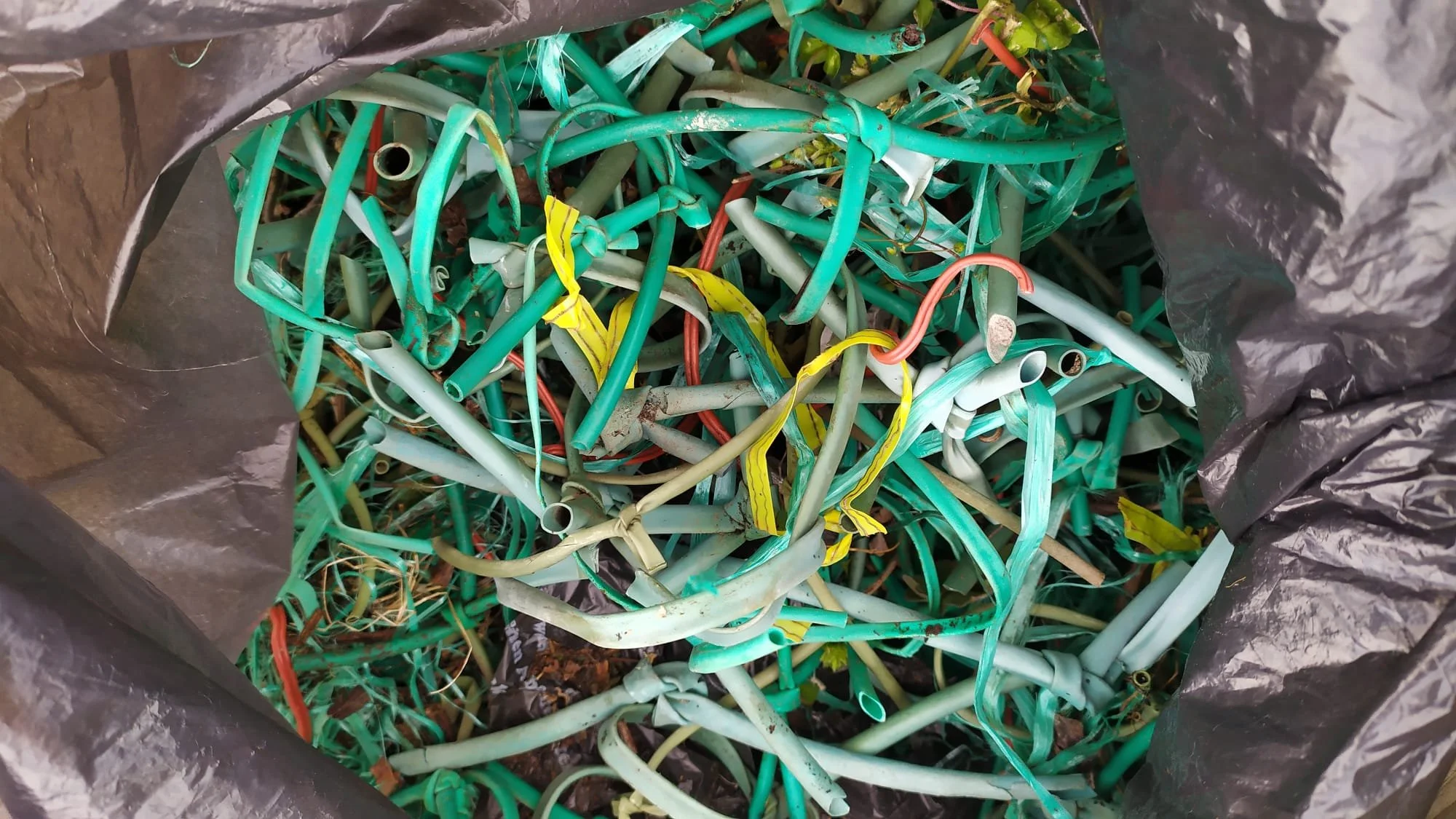Des ratissages minutieux du terrain ont permis de mettre en évidence la quantité de plastique utilisée pour attacher les sarments de vignes d’année en année. Sur les 4000m2 du terrain, la quantité se mesure en kilos (environ 6 kilos au moment où nous écrivons ces lignes et il en reste encore…) et cela sans compter les attaches en nylon qui sont partout, désagrégées par les UV.