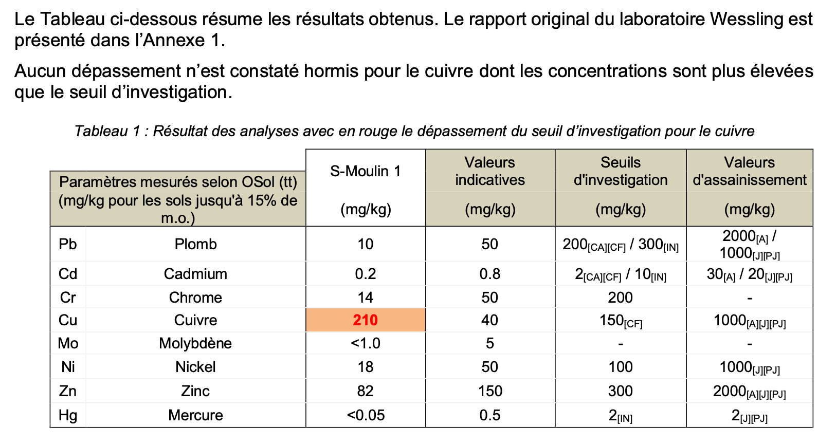 Pour cette partie, le bureau d’étude a procédé à un échantillonnage du sol qu’il a fait analyser par un laboratoire. Les résultats du test sont à voir ci-dessous.